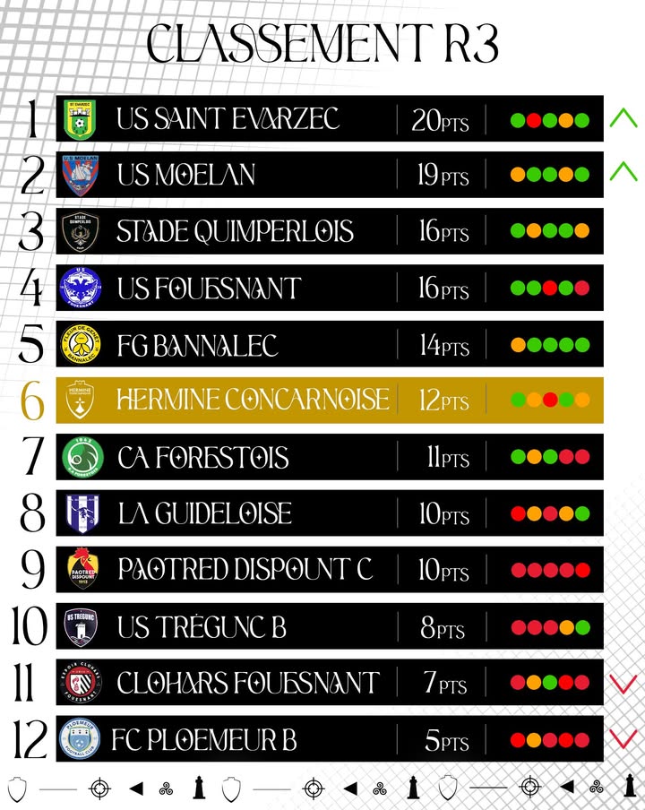 L’𝐞𝐪𝐮𝐢𝐩𝐞 𝐀 en 𝐑𝟑 actuellement 6e sur 12. Un classement qui reflète un début de saison correct, avec encore deux matchs à jouer avant la mi-saison, face à l’US Saint-Évarzec et à la FG Bannalec. Le prochain rendez-vous se jouera au Moros, à domicile contre Bannalec, un match important pour prendre des points 👊🏽